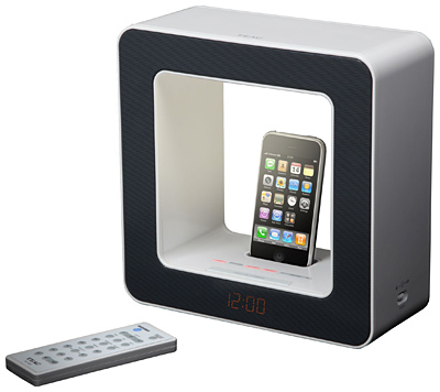 「SR-LUXi」は、iPodとiPhoneにも対応。正方形の本体中央にiPod/iPhoneを置き、充電しながら再生できる。