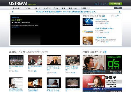「Ustream」は、PCやスマートフォンからライブ動画を配信・視聴できるWebサイト。コンテンツは映画や音楽、スポーツなどを配信する。2010年4月には、月間のユニークユーザ数が1億人を突破したという。