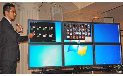 発表会では、CPUの処理能力の高さを示すデモンストレーションを実施。デジタルカメラのRAWデータを現像する、フルハイビジョン画質の映像を再生するといった、マシンに負荷のかかる複数の動作を、6枚の液晶ディスプレイで同時に実行した。