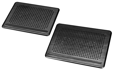 厚さ22mmのスリムなノートPC用クーラー。きょう体前面部に放熱性の高いアルミプレートを採用し、さらに低回転のファンを複数使用することで、「木葉のふれあう音」と同じ程度の20dB以下の静音性能と高い冷却性能を実現した。