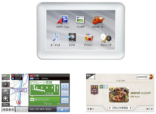 タッチパネル対応の4.7型液晶モニタを搭載するポータブルナビゲーション。約1000件の料理レシピを収録した「クックポーター機能」を搭載し、季節や調理方法を入力すれば、料理を検索できる。