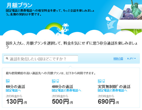 スカイプ・テクノロジーズ S.A.は、5月6日、インターネット電話サービス「Skype」を利用した固定電話や携帯電話への有料通話について、新たな月額プランを世界170か国以上で導入した。「Skypeクレジット」を事前に購入するプリペイド方式と比較して、最大60%割安になるという。