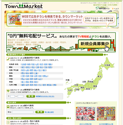 「タウンマーケット」は、スーパーや飲食店などの店舗のチラシをウェブ上で簡単に検索・閲覧できるサイト。全国を対象としたオンラインサービスのほか、関東の一部地域では、毎週金曜日に1週間分のテレビ番組表を掲載したTV情報誌『Town Market TV』と一緒に地域のチラシを無料で届ける宅配サービスも提供している。