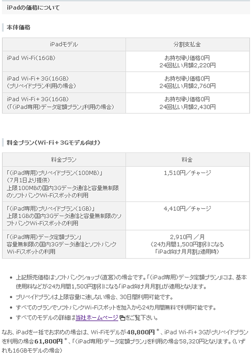 「iPadの価格について」(ソフトバンクモバイルのWebサイトより)