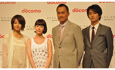 NTTドコモは、5月10日、5月11日から放送を開始する新CMの発表会を開催した。CMのコンセプトは「ひとりと、ひとつ。walk with you」。渡辺謙さんや木村カエラさんが、それぞれ岡田将生さんと堀北真希さんの携帯電話に扮するという、ユニークな作品に仕上がった。