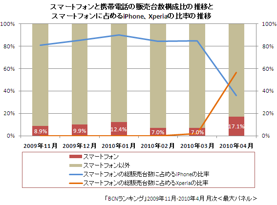 2010年はスマートフォンの本格的普及元年となるのか―。4月1日に発売されたNTTドコモのスマートフォン「Xperia(エクスペリア)」の売れ行きが好調だ。「BCNランキング」によると、携帯電話全体の販売台数に占めるスマートフォンの比率は、2010年3月の7.0%から4月は17.1%に急上昇。新規に家電量販店で購入された携帯電話のおよそ5台に1台弱がスマートフォン、という結果になった。