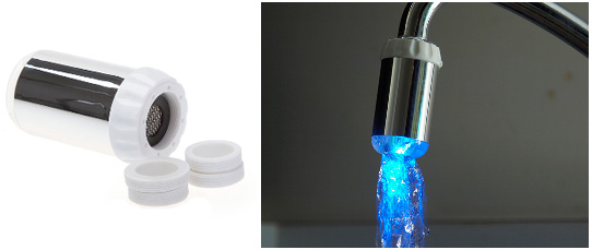「温度センサー付きLED蛇口ホルダー」は、35度以下でブルー、36-95度でレッドに変わる。水とお湯がひと目で判断できるので、やけど防止にもなる。ボタン電池LR44×3を使用。本体サイズは長さ65×直径35mm。