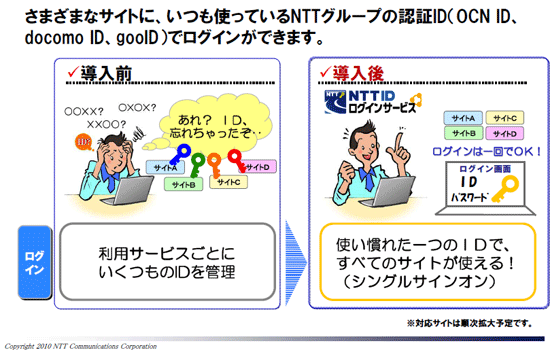 OpenIDの仕組みを利用したもので、NTT Comの「OCN ID」、NTTドコモの「docomo ID」、NTTレゾナントの「gooID」のいずれかの認証IDで一度ログインすると、「NTT ID ログインサービス」に対応する会員向けサイトやECサイトで、再びログインせずに利用することができる。