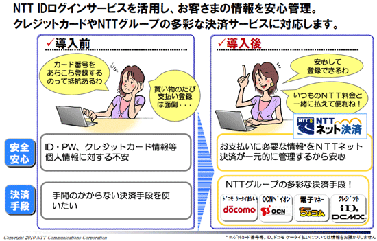 2010年度第2四半期には、「NTT IDログインサービス」を活用した決済連携サービス「NTTネット決済」を開始する予定。クレジットカードのカード番号など、決済に必要な情報を預かり、対応サイトなら、ユーザーが情報を直接登録することなく決済できるようにする。