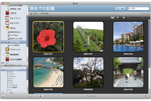 実は、米Filemakerはアップルの関連会社。その企業が開発した製品だけに、Mac OS Xとの連携はよく考えられている。最新版の「Bento 3」は、iPhotoに登録したアルバムをライブラリ欄に表示し、インポートなしで扱えるようになった。iPhotoライブラリの内容をBentoでただ参照するだけ、というわけではなく、「写真に情報を追加したうえでデータベース化する」「Bentoで管理している連絡先やイベントなどの情報を写真にリンクさせる」といった次元の高い連携ができることが大きなメリットだ。