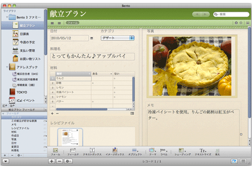 なかでも「献立プラン」は、Bento 3の機能をうまく生かしている。写真欄に挿入する写真はiPhotoライブラリから直接読み込むことができ、PDFなどの形で保存するレシピファイルは、クイックルックで内容を確認できる。クイックルックとは、Mac OS X 10.5(Leopard)で追加されたファイルの内容をすばやく閲覧できる機能。ちなみに、Bentoではバージョン2からサポートしている。