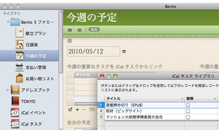 まずは、個人向けのテンプレートをみていこう。「Bento 3 ファミリーオーガナイザー」は、5月に公開したばかりの新しいBento 3専用テンプレート。料理のレシピを管理する「献立プラン」、iCalと連携してスケジュールやタスクの管理ができる「今週の予定」、請求明細や支払日などを管理する「支払い管理」、家族の家事分担をチェックする「日課表」、どこで何を買うかを記録する「お買い物リスト」の5種類を揃え、いずれも日常生活で役立てられるものばかりだ。