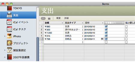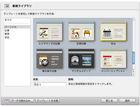 旅行やおけいこごとなど、どのような活動にいくらお金を使ったのか、という情報を管理するテンプレートが「支出」。Bento 3に標準装備しているものだ。ファイルメニューから「テンプレートからライブラリを新規作成……」を実行すれば、すぐに作業に取りかかることができる。データベースとしての要素はシンプルで、「金額」や「支出タイプ」「日付」などのデータをインプットしていくだけ。表示方法を「表形式」に変更することもできる。