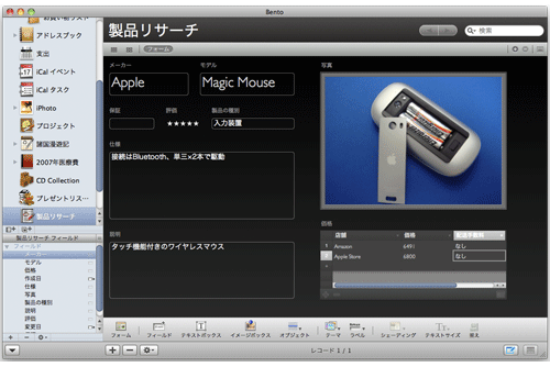 次は、法人向けのテンプレートだ。「備品や消耗品は1円でも安く購入すべし」と、上司から経費削減の厳しいお達しが出ている企業は少なくないはず。そんなせちがらい状況で役立つテンプレートが、「製品リサーチ」だ。製品の仕様と写真をデータベース化することが基本機能だが、Bento 3の新機能「簡易リストフィールド」を使えば、店舗ごとの価格や配送料を比較することができる。