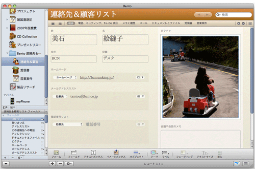 「Bento 3 連絡先&顧客管理」は、人の名前やメールアドレスのほか、iPhotoライブラリに保存している顔写真を使用したり、iCalに登録する関連のイベントやタスクを登録したり、さまざまなアプリケーションを横断して連携ができる。用途別に「連絡先&顧客リスト」「受領書」「営業案件」の三つのテンプレートがあり、それぞれデータを関連付けて記録することができる。
