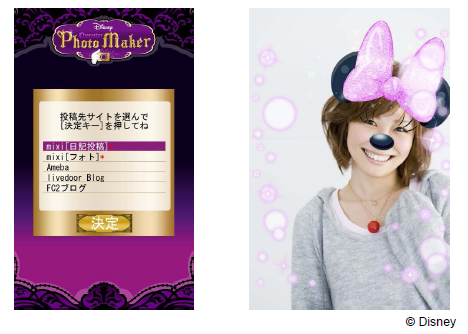 「Disney Player」などのオリジナルエンタテインメント・コンテンツや、着せ替えアレンジ、壁紙などのオリジナル素材も充実。被写体がどのキャラクターに似ているかを自動判定する人気の「ディズニー・キャラクターフォトメーカー」には、判定後の画像をブログやSNSサイト「mixi」の日記に直接投稿できる機能やグリッター感のある新テーマを使ったコンテンツを追加した。