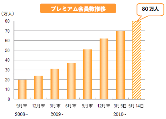 また同日、ニワンゴは、「ニコニコ動画」のプレミアム会員数が5月14日に80万人を突破したと発表した。動画を快適に視聴できるプレミアム専用回線の提供や混雑時の低画質モードの回避、「ニコニコ生放送」混雑時の優先視聴など、さまざまな特典が得られるプレミアム会員サービスは、2007年6月18日に開始。翌年の2008年5月24日に20万人、2009年3月16日に30万人、2010年3月5日に70万人を突破し、それから約2か月半で80万人を突破した。