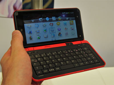 スマートフォンは、3機種を投入する。ネットブックのような形のシャープ製スマートフォン「LYNX SH-10B」は、解像度960×480ピクセルの5型ディスプレイやQWERTYキーボードを備え、メール作成やウェブ閲覧、ブログ投稿などが快適に楽しめる。「mixi」や「Twitter」など、本体を開いてすぐに使える20種類のウィジェットを搭載。幅148mm、重さ230gと、両手で持って操作しやすい小型・軽量ボディだ。カラーはレッドとホワイトの2色。7月発売予定。