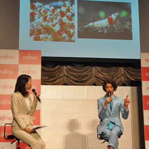 富士通は5月20日、NTTドコモの携帯電話夏モデルとして、フルハイビジョン(フルHD)の動画が撮影できる、タッチパネル搭載のスライド式端末「docomo PRIME series F-06B」など3機種を発表した。前回に引き続き、CMキャラクターには俳優の瑛太さんを起用。熱帯魚の動画撮影中に「いいね~」のひと言を漏らすシーンの裏話を語った。
