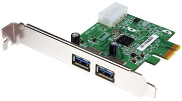 従来のUSB2.0と比べデータ転送速度を約10倍に向上したUSB3.0ポート×2の拡張カード。最大5Gbpsでデータを転送する。接続インターフェースはPCI Express 2.0×1で、多くの市販マザーボードとの互換性をもつ。2年間の保証付き。