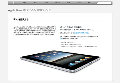 アップルの直営店「Apple Store(アップルストア)」は、5月28日発売の「iPad」を同日午前8時から販売する。
