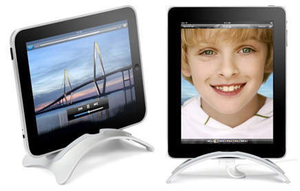 弧を描くデザインと滑らかなスチールの質感が特徴のiPadスタンド。iPadを動画や写真の鑑賞、アプリケーションの利用、ウェブ閲覧に最適な角度で立てかけられる。