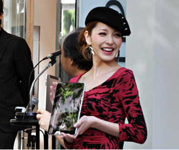 発売直前、ソフトバンク表参道店前は、iPadをいち早く手に入れようと並んだ約250人と、それを取材する報道陣でごった返した。そこに登場したのは、孫正義社長と藤井リナさん。