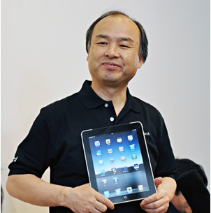 記者会見で、iPadをアピールする孫社長