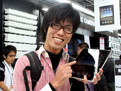 辺見さんは、5月10日に始まった予約受付けで、3G/Wi-Fi(無線LAN)対応でメモリ容量64GBのモデルを予約。以前はアップルの携帯電話「iPhone」の購入も検討していたが、「ディスプレイが大きく、iPhoneの操作性をもつiPadに決めた」という。購入後は「まずはインターネットをしてみたい。それからTwitterとmixiで友達に買ったことを自慢します」と笑顔で話した。