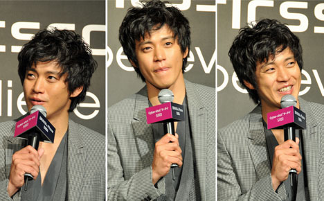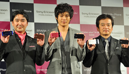 新端末を披露するソニー・エリクソンの仲井一雄社長(右)、小栗旬さん、高垣浩一常務