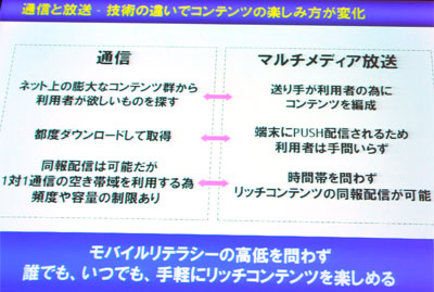 メディアフロー技術を用いたサービスを提供するメディアフロージャパン企画の増田和彦社長は「ユーザーにとって、アクションを起こすことが不要で、今までコンテンツに触れられなかったユーザーを獲得できる」と新たな市場へ期待を寄せる。また、マルチメディア放送は「受信端末の普及がキーファクター」として、受信端末の開発・普及支援を表明した。
