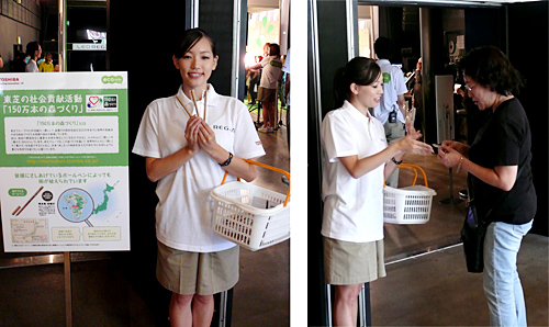 ブース付近では、森づくりを応援する「樹をうえるボールペン」をプレゼント。東芝グループが取り組む社会貢献活動「150万本の森づくり」の一環で、植林活動につながるものだ。