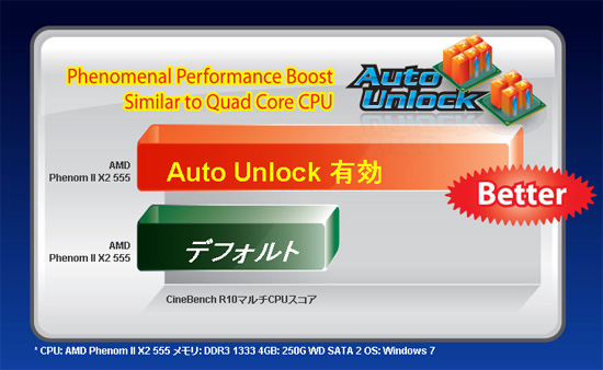 ユニークなのが、AMD製のマルチコアCPUの“隠しコア”を有効にする「Auto Unlock」という機能。これを有効にすることで、隠しコアのあるCPUであれば、なんと2コア仕様を4コア仕様へ、4コア仕様を6コア仕様へとアップグレードできる。ギガバイトのアナウンスによれば、AMD PhenomII X2 255を用いてこの「Auto Unlock」を有効にし、定番の3Dベンチマークソフト「CINEBENCH R10」で測定したとき、デフォルト状態に対して、最大で2倍近くのスコアを記録するという。