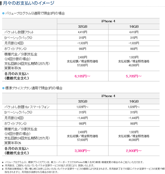 iPhone 4向け料金プランとして、月額4410円で使い放題のパケット定額制プラン「バリュープログラム(i)」、最低月額1029円から使ったパケット量に応じて支払い金額が変わるパケット定額制プラン「標準プライスプラン」を用意。契約時にどちらかを選ぶ。