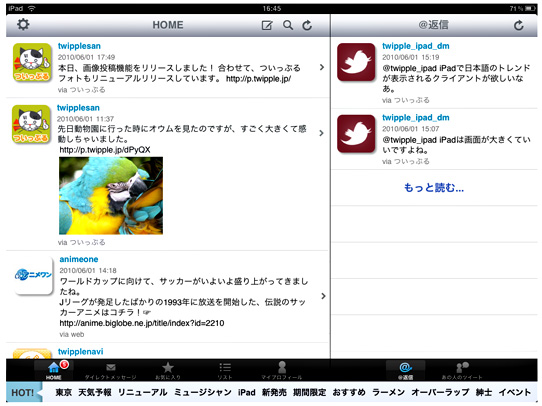 NECビッグローブは、6月14日、iPadからミニブログ・サービス「Twitter(ツイッター)」をより効率的に活用できるアプリケーション「ついっぷる for iPad」の無料提供を開始した。