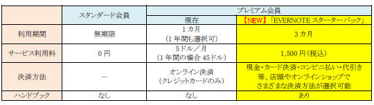 通常のスタンダード会員とプレミアム会員、「EVERNOTE スターターパック」のサービス比較
