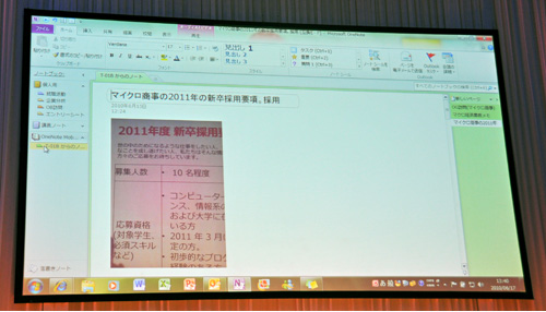 「就職活動編」では、新しいWindows Live Hotmailでブラウザから直接Officeのファイルを閲覧・編集できる機能、Windows Live SkyDrive上に保存したOneNote文書をスマートフォンで開き、スマートフォンで撮影した写真を貼り付けると、PCで開いている文書にも写真が貼り付けられる機能などを紹介。