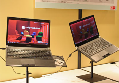山下さんは、6月21日の東芝ノートPC25周年記念新商品発表会に、シックなグレイのスーツに身を包んで登場。深串方彦・執行役上席常務デジタルプロダクツ&ネットワーク社社長とともに、新製品を披露した。