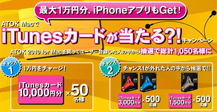 ジャストシステムは、Mac向けの日本語入力システム「ATOK 2010 for Mac」を7月16日に発売することを記念し、抽選で最大1万円分のiTunesカードを総計1050名にプレゼントする「ATOK MacでiTunesカードが当たる?!キャンペーン」を開始した。期間は6月22日から9月30日まで。