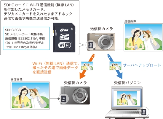 無線通信機能内蔵型SDカードは、SDHCカードにIEEE802.11b/802.11g規格のWi-Fi(無線LAN)に準拠した無線通信機能を付加したもの。SDHCに対応したカードスロットをもつデジタルカメラなどにこのカードを挿入すると、パソコンを介さず、対応機器同士で画像データを相互に送受信できる。対応フォーマットはJPEG/RAW、カードの容量は8GB。