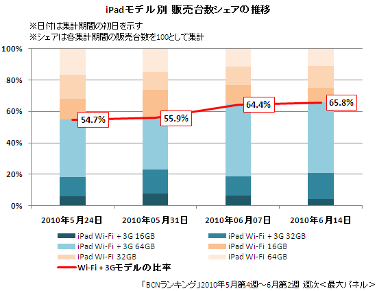 発売日の5月28日を含む、2010年5月第4・第5週、6月第1・第2週のおよそ3週間(2010年5月24日-6月20日)の累計販売台数を集計すると、一番人気は3Gの64GBモデル「MC497J/A」だった。シェアは38.0%で、期間中のiPad全体の販売台数の4割近くを占める。2位から4位まではWi-Fiモデルの64GB、32GB、16GBが並び、その後、3Gモデルの32GB、16GBが続く。