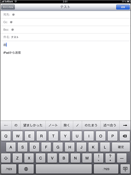 iPadのテキスト入力画面。たとえば「の」と入力すると、変換候補が表示される。