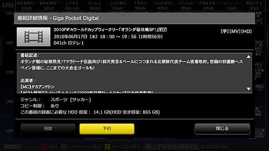 録画機能は、BDレコーダーに匹敵する使い勝手だ。前述の通り、ダブルチューナーを備え、2番組同時録画ができるし、MPEG2-TS録画時の容量はHD画質で1時間7.5GB(地デジ:17Mbps)。AVC録画時の容量はHD標準で1時間2GB(4.5Mbps)となる。同時録画のときも、両方ともAVCにエンコードしながら長時間録画ができるのはうれしいところだ。