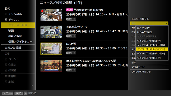 初期設定でモバイル用の番組データも同時に記録しているので、メモリースティックやPSPに書き出すことができる。録画番組の解析をリアルタイムに行っているのもすばらしい。従来は、録画後に処理が必要だったのだが、モバイル用のデータを元に解析しているので、録画終了と同時にダイジェスト再生などが可能になる。