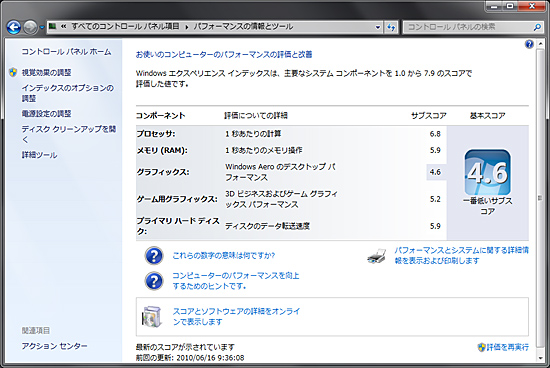 OSがWindows 7 Home Premiumの64ビット版、CPUにはCore i5 450Mを搭載。メモリは4GB、HDDは1TBと余裕のスペック。ベンチマークソフトで計測したところ、Windows 7のエクスペリエンススコアはCPUが6.8、メモリが5.9と高い結果を出した。後ほど説明するフルHDの映像をダブル録画するには相当なパワーが必要なのだが、十分クリアしている。