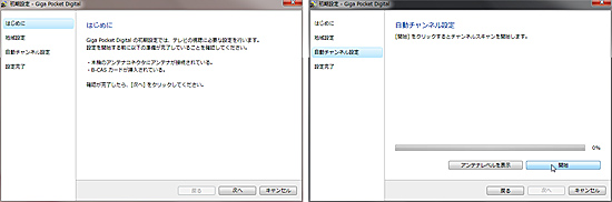 アンテナケーブルと電源は背面で接続する。地上・BS・110度CSデジタルチューナーは、それぞれ2基ずつ搭載しているので、ダブル録画ができる。セットアップは、B-CASカードをセットしてアンテナケーブルを接続するだけ。リモコンの「テレビ」を押すと、設定画面が開くようになっている。そして、まずは、チャンネルのスキャンを行う。