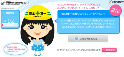 キングソフトは、6月22日、7月中旬のクラウド型セキュリティソフト「KINGSOFT InternetSecurity 2011」発売に先駆け、セキュリティについて修行するキャラクター「謎の少女」が登場するユーザー投稿型キャンペーンサイト「Buchake!!キングソフト」を開設した。