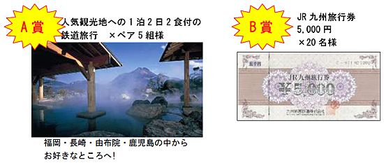 抽選で、人気観光地への1泊2日2食付のJR九州指定の鉄道旅行がペア5組に、JR九州旅行券5000円が20名に当たる。当選者には、9月下旬に賞品を発送する。