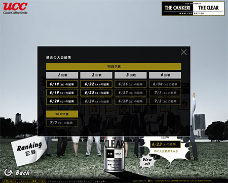 UCC上島珈琲は、2010年3月に発売した無糖缶コーヒーの新ブランド「UCC THE CLEAR」のプロモーションとして、ウェブとリアル世界の缶けり大会「THE CANKERI THE CLEARキャンペーン」を展開している。これに伴い、6月18-20日に実施した予選1回戦の結果を明らかにした。参加者は720人。2回戦は6月22-24日に実施する予定。