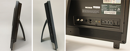 オンキヨーのE713シリーズ「E713A9B」は、地上・BS・110度CSデジタルテレビチューナーやBDドライブを搭載した23型液晶一体型のパソコンだ。本体は艶のあるブラックで、液晶下部にスピーカーを搭載している。液晶の解像度は1920×1080画素のフルハイビジョン。画質は黒が引き締まり、鮮やかですばらしい。視野角も広く、家族など複数で見るにも問題なし。背面のスタンドを倒せば角度の調節も可能。スタンドはしっかりした作りで、安心感がある。